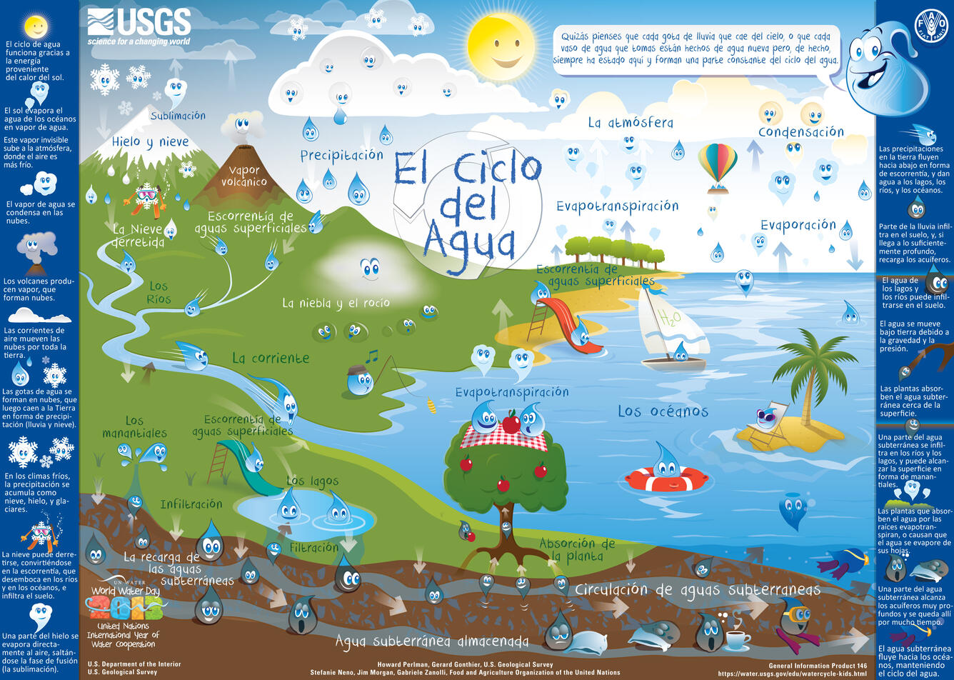 El Servicio Geológico de los Estados Unidos (USGS) y la Organización de Alimento y Agricultura de las Naciones Unidas (FAO) han colaborado para traernos este diagrama sobre el ciclo del agua para niños