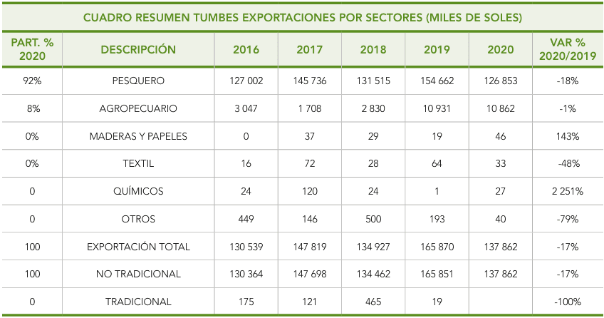 En 2020, las exportaciones con ubigeo Tumbes, con respecto al sector pesquero bajaron 17% por menores ventas de langostino -18%: (colas y enteros). Adicionalmente, cayeron las ventas de filete de pescado -63%, pota -23% y otros productos pesqueros que no registraron ventas: concha y harina.