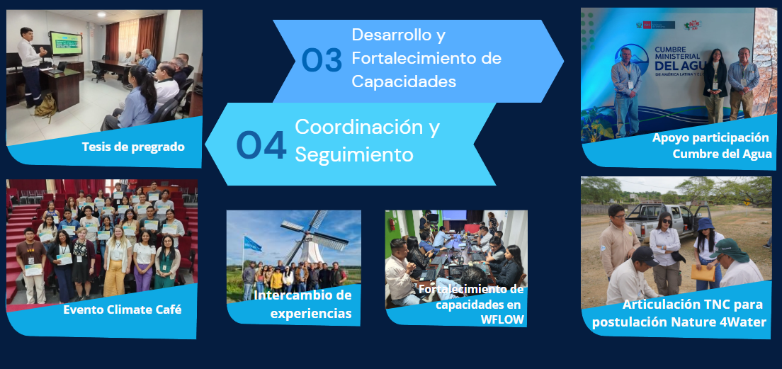 En 2024, el Proyecto Blue Deal financió el desarrollo del modelo hidrológico de las cuencas del ámbito del CRHC Tumbes utilizando la herramienta WEAP, con el objetivo de fortalecer la planificación y gestión integrada del recurso hídrico. La consultoría fue ejecutada por el Stockholm Environment Institute (SEI) y comprendió tres componentes principales: i) modelación de las interacciones entre fuentes y usuarios de agua superficial y subterránea en el ámbito del Consejo, ii) capacitación al personal técnico de la Secretaría Técnica y a profesionales vinculados a la gestión hídrica en la región, y iii) socialización de resultados ante representantes de la Secretaría Técnica, el Consejo de Cuenca, la sede central de la Autoridad Nacional del Agua y el equipo Blue Deal Perú.