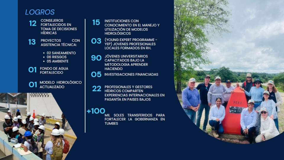 Asimismo, gracias al apoyo financiero del programa, tres delegaciones peruanas han viajado a Países Bajos para intercambiar experiencias y conocimientos en gestión del agua. Estas, han estado conformadas por consejeros de la cuenca Chira - Piura y Tumbes, por representantes de sus respectivas Secretarías Técnicas, por miembros de la Autoridad Administrativa del Agua Jequetepeque Zarumilla y de la sede central.