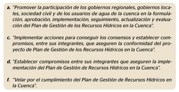 El artículo 31º del Reglamento de la Ley de Recursos Hídricos establece las funciones de los Consejos de Recursos Hídricos de Cuenca, entre las cuales se encuentran los siguientes incisos: